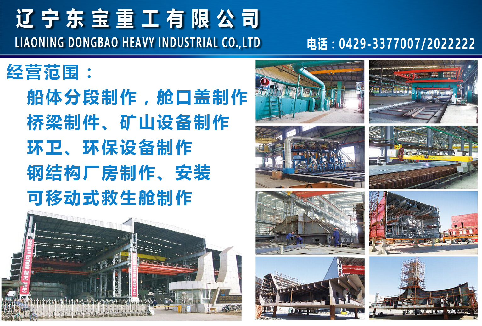 Liaoning Dongbao Heavy Industry Co., Ltd. is located in Huludao Marine Engineering Supporting Park, covering an area of 80,000 square meters and a total construction area of 56,000 square meters. 公司主要經(jīng)營范圍:船體分段制作,艙口蓋制作, 橋梁制件、鋼結(jié)構(gòu)廠房制作、環(huán)衛(wèi)、環(huán)保設(shè)備制作,礦山設(shè)備制作及可移動式救生艙的制作。在制造安裝方面具有豐富的經(jīng)驗和雄厚的技術(shù)力量,是造船、石油、電力、礦山企業(yè)的長期合作伙伴。